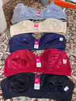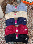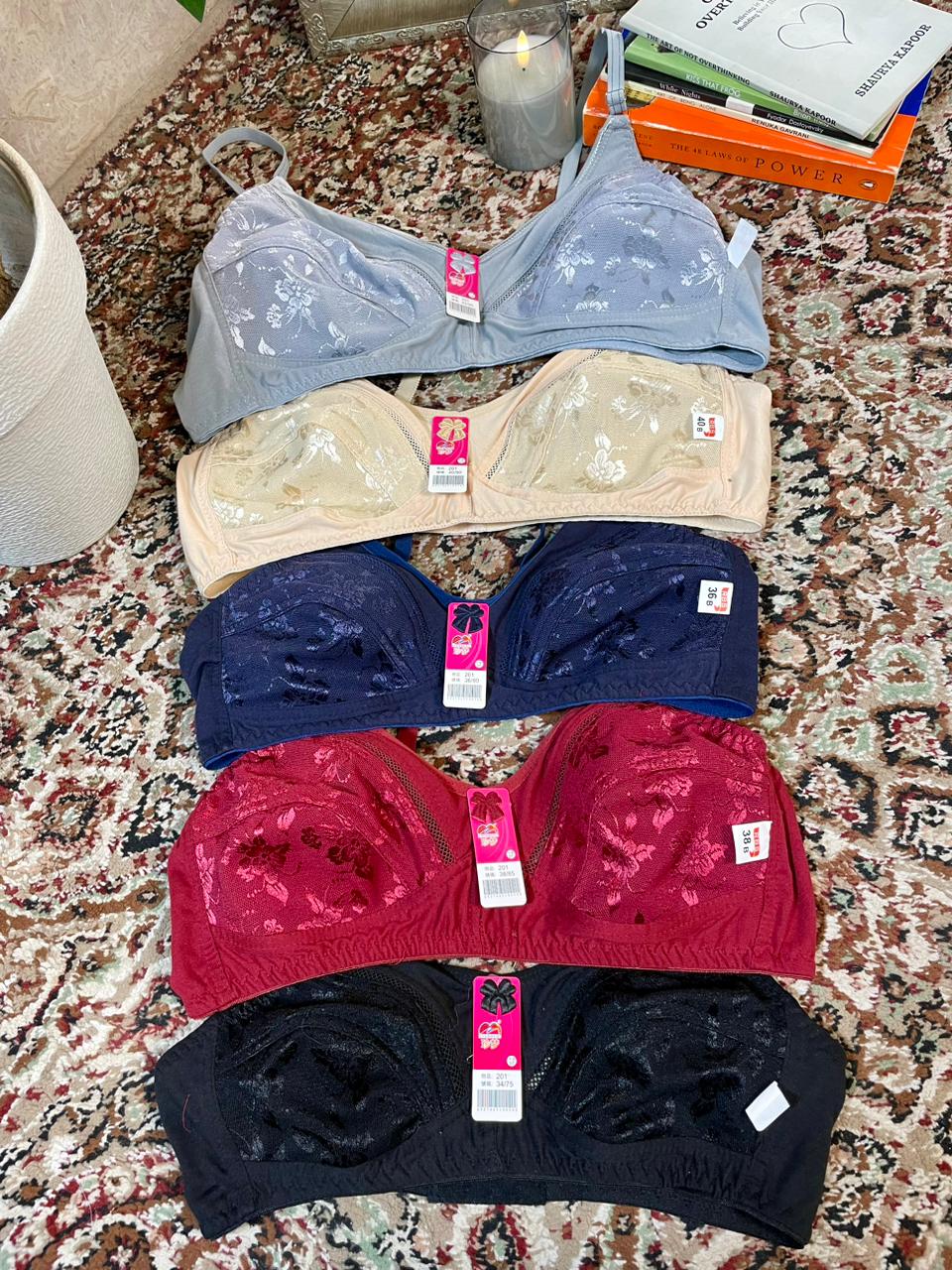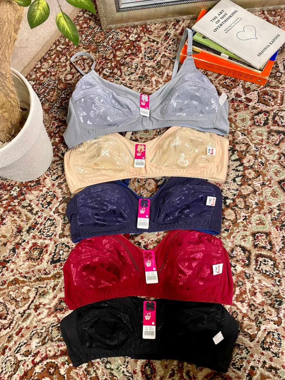 These are non-padded, wire-free cotton bras with a floral jacquard/embossed pattern. The collection features 5 colors: grey, beige/skin, navy blue, maroon/red, and black.
