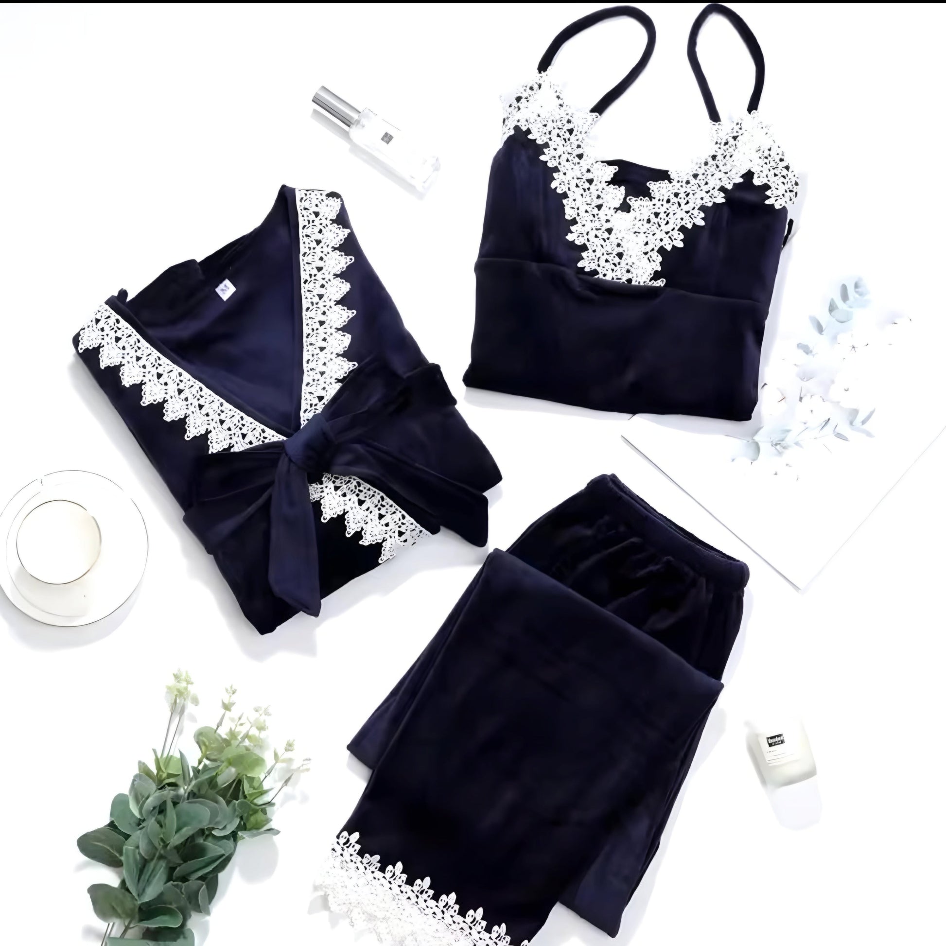 Ultimate comfort and elegance with our luxurious 3-piece bridal set, crafted with soft, rich velvet in a deep hue. This set includes a lace-trimmed robe, a chic lace-trimmed inner camisole, and Lacy trouser, all designed to add a touch of Elegance to your nightwear collection. Perfect for cozy nights in, romantic evenings, or as a thoughtful gift. Embrace style and comfort with this premium velvet and lace ensemble.